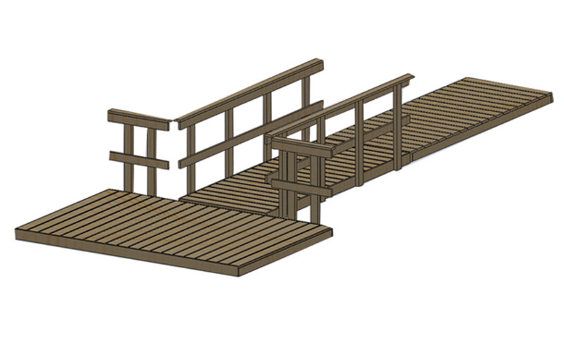 Причал - это инженерное сооружение состоящее из настилов поддерживаемых на воде пластиковыми модулями плавучести (понтонами). Основание настила выполнено из высококачественной древесины обработанной специальными средствами, предотвращающими гниение. Верх настила - террасная доска (специальный материал применяемый при строительстве гидротехнических сооружений).